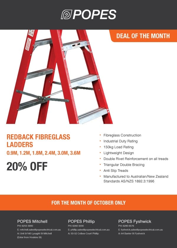Our Deal of the Month for October is a 20% discount on all Redback Double-Sided Ladders. This deal is available until the end of October 2017 at all POPES Electrical & Data Supplies stores.