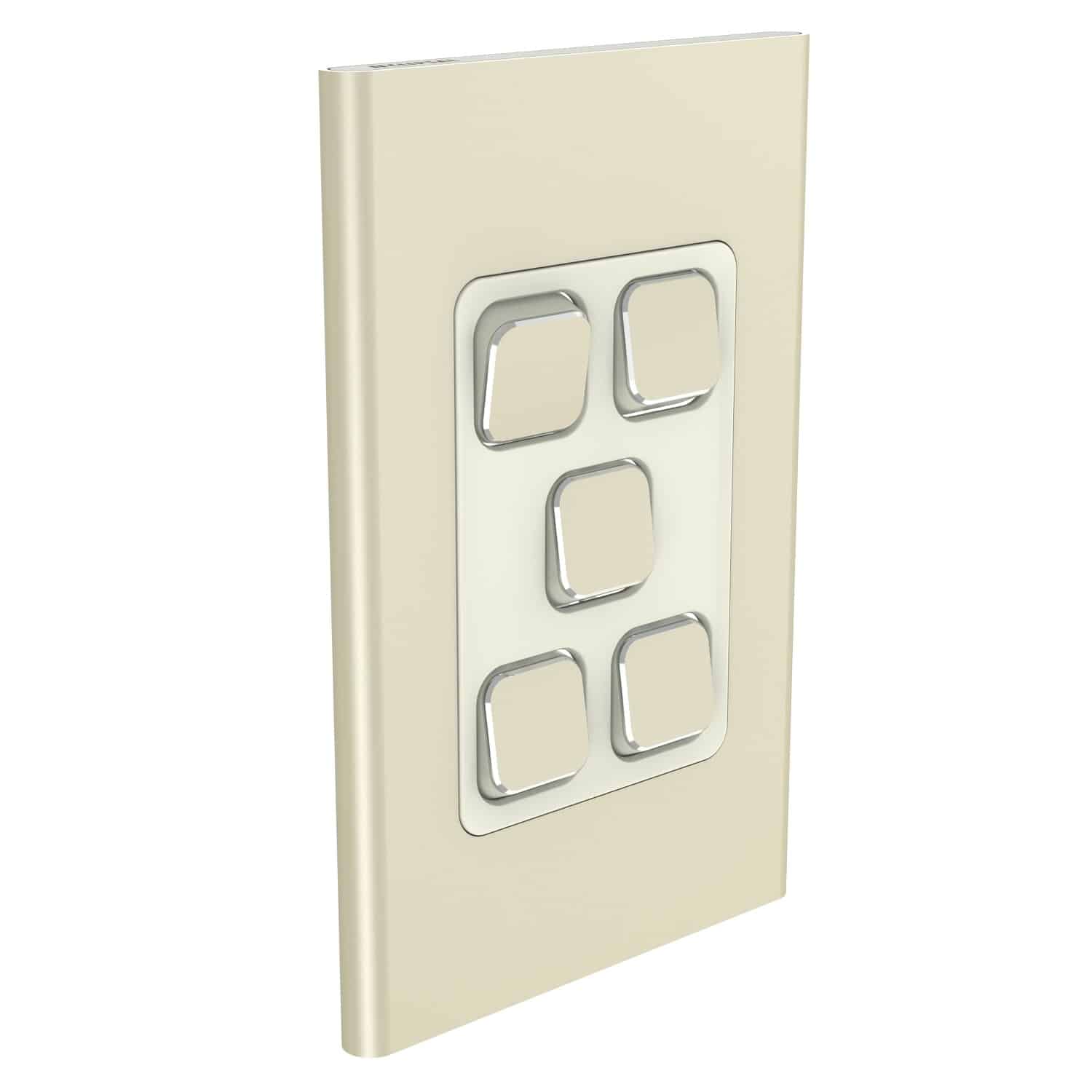 Skin Switch Iconic Styl – 5-gang – Crowne Decorative clip-on skin. Used with switches. Suitable for 5-gang installations. Clipsal Iconic Styl. Colour: Crowne